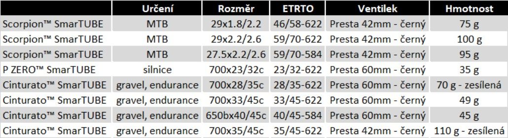 SmarTUBE je nejnovější produkt Pirelli v kategorii cyklistických duší a je pokračováním snažení Pirelli o vylepšování výkonu v moderní cyklistice. Je výsledkem vývoje galusek pro World Tour, kdy byla tato technologie přenesená a přizpůsobená pro použití běžnými cyklisty s plášti a dušemi. Nové duše jsou vyrobené z termoplastového polyuretanu (TPU), ušetří vám zhruba 70 % hmotnosti běžných duší a zaberou o 50 % méně místa ve vašich kapsách. Zároveň jsou odolnější než duše čistě z butylu. Duše jsou dostupné v široké nabídce rozměrů: silniční (P ZERO™ SmarTUBE), zesílené Gravel a Endurance varianty (Cinturato™ SmarTUBE), a MTB (Scorpion™ SmarTUBE).